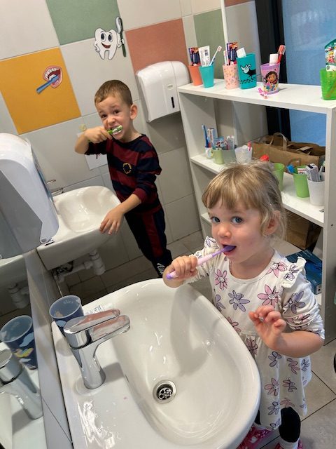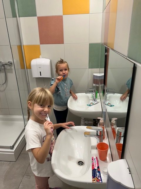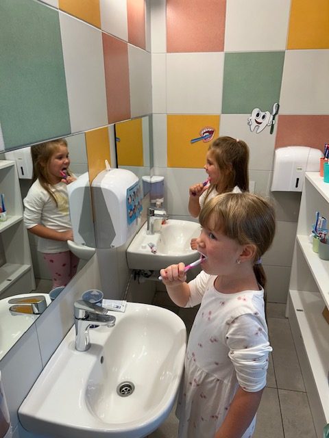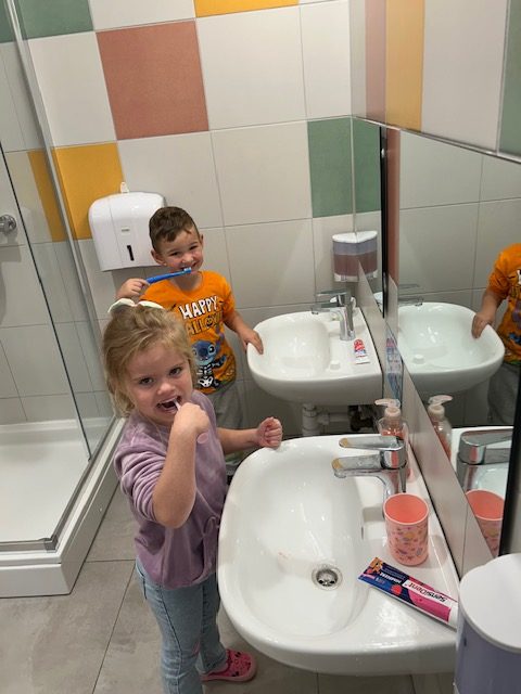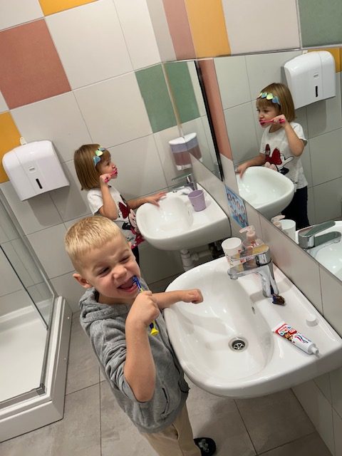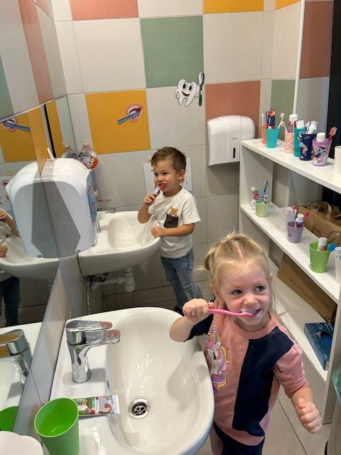 Potom je svako dijete dobilo svoju četkicu i pred ogledalom vježbalo pravilnu tehniku pranja zuba. Uz veselu glazbu i pjesmicu o pranju zubi, djeca su s osmijehom i puno truda pokazivala naučeno. Oduševljenje se moglo vidjeti na njihovim licima dok su ponosno „četkala“ i pokazivala kako se brinu o svojim zubićima.